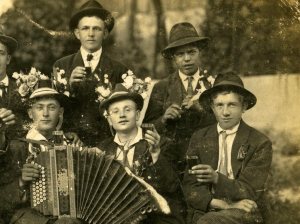 O naborih, štelngah je bilo v starih slikah že veliko napisanega. Takole veselo ter primerno za tak dogodek pa so se naborniki letnik 1905 z Rakeka postavili, posedli pred fotografskega mojstra Ivana Tišlerja potem, ko so bili potrjeni, da so sposobni za vojaški stan. Nabor je bil okoli leta 1924. Okrašeni s šopki cvetja, ki so si jih ponosno zatikali za klobuke ali pripenjali na obleko so proslavljali ta dan. Po njihovem videzu se vidi, da je moralo biti jako naporno. Koncentracija je popustila, kravate so šle svojo pot, maligani so opravili svoje. Po blatnih čevljih in hlačah pa tudi, da so dogodek proslavili kljub verjetno slabemu vremenu z veseljačenjem in plesom. Sredi skupine je godec Ivan Štrukelj vsem znani kot »Rajcov Ivan«