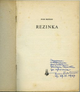 Ivan Matičič je v knjigo Rezinka zapisal posvetilo: Dragemu, iskrenemu prijatelju Hrvoju Maistru za spomin. Ivan Matičič Lj., 29. III. 1967