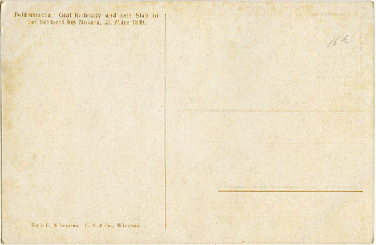 Slika predstavlja feldmaršala Josefa Radetzkyja in njegov štab v bitki pri Novari, 23. marca 1849. Naslikal jo je Fritz Neumann. Velika je 27,5 cm krat 17,5 cm. Spada v cikel bojnih prizorov cesarske avstrijske vojske.