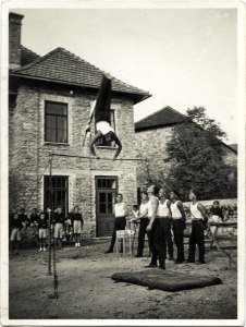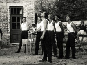 Fotografija neznanega fotografa, iz zbirke Toneta Urbasa, prikazuje nastopati Sokole v Cerknici.
