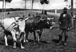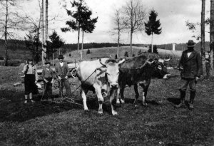 Furman je z gajžlo poganjal in miril vola, da sta lepo enakomerno vlekla, najprej plug, potem pa še brano.Kraj: med Rakekom, Uncem in Ivanjim selom
