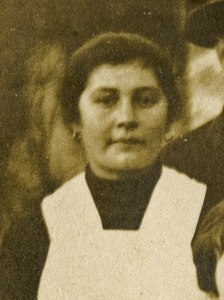 Bel predpasnik je bil nekoč obvezen del dekliške nedeljske obleke, zato nikakor ne smemo misliti, da so dekleta na sliki natakarice, ni pa izključeno, da katera od njih vseeno je. Tisti dve, ki sedita in imata enaka z bogato čipko obrobljena predpasnika do pasu, pod ovratnikoma na bluzah pa črn – žameten(?) – trak, sta zelo verjetno dobri prijateljici, saj je bilo tedaj velik znak povezanosti oblačenje v enaka oblačila. Tudi na rokavih imata obe prišit enak temen trak in najbrž sta imeli isto šiviljo. Predpasnika drugih dveh deklet segata čez prsi, sta zanimivo krojena in okrašena z naborki. Tisti iz črtastega blaga ima kroj nadvse prefinjeno zložen glede na vzorec. Je bila katera od teh deklet šivilja?