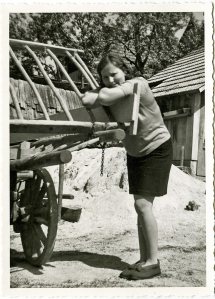 Marija Perko ob vozu, pripravljenem za prevoz sena. Spodaj so bile na vsaki strani rahlo dvignjene lojtre. Na vsakem koncu sta bili z verižicami pripeti še dve pokončni lojtri. Na koncu sta bila dva preklca (klinca) bolj skupaj, vmes pa zataknjena dila malo daljša kot je bil voz, ki je imela na vsakem koncu kratko lajšto, da se ni mogla izmuzniti iz lojtre. Dila se je dvigala hkrati z višanjem sena na vozu. Seno je moralo biti močno zatlačeno za dilo, tako da je imel popolnoma naložen voz obliko pivskega trebuha, povezanega z dilo. Ko je bilo pobiranje sena zaključeno je bilo treba voz očesati, da se ni seno zgubljalo po poti.