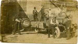 Levo zadnji ob sodu naj bi bil Mirko Vidrih, na kamionu stoji na desni Mirko Juvančič, spodaj desno pred kamionom pa je Anton Šemrov.