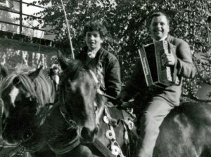 Na konjih sta vesela in nepogrešljiva spremljevalca rekrutov na štelengi – furman in godec.