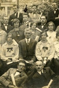 Pevci in pevke, sami mladi ljudje, vsi v nedeljskih oblekah, držijo v rokah papirnate zvitke, najbrž besedila in note, in vsi imajo na prsih okras – šopek ali pentljo. Trenutek je bil pomemben že zaradi fotografiranja samega, pa tudi dan gotovo ni bil navaden delavnik – in dobro so se pripravili nanj.