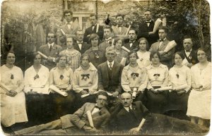 Pred skupino ležita moška. Desni v temni obleki je Alojz Mlakar, trgovec.1