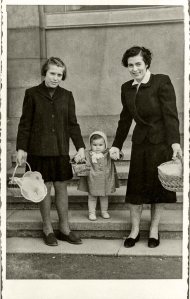 Teta je oblečena v belo bluzo in klasičen temen kostim po takratni modi. Za ta posebni praznik ima svežo pričesko, lepo hladno trajno ondulacijo, ki jo krasi še žametni obroč. Soseda Marjeta pa si je nadela krilo, puli in pomladno jakno. Jaz sem oblečena v siv plašček, na glavi imam čepico s svečano malo mašno. Teta in soseda držita v roki vsaka svojo košaro dobrot, tudi jaz nosim simbolično majhno otroško košarico. Še kot majhna deklica sem bila namreč dostikrat pri teti in stricu v Ljubljani. S starši sem sicer živela v Zenici. Mama Vera je opravljala učiteljski poklic, oče Drago pa se je tedaj še izobraževal. Teta in stric nista imela otrok, zato je teta z veliko ljubeznijo skrbela zame in je bila odlična nadomestna mama.