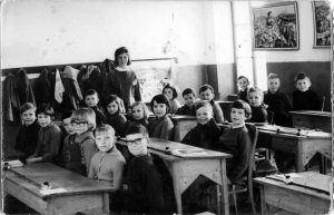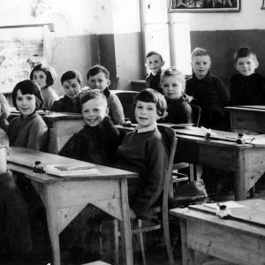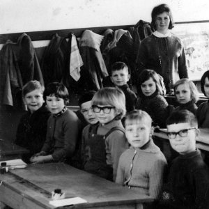 Učenci 2. razreda osnovne šole 11. maj Grahovo so se 19. 5. 1965 slikali kar v razredu. Na sliki je 19 učencev in razredničarka Kristina Gangl. V razredu sta bila dvojčka Anica in Vinko Mavko iz Žerovnice. Zadaj za razredničarko se lepo vidi garderoba, ki je bila takrat vedno kar v razredu. V oči takoj padejo lesene šolske klopi, ki so bile po dolžini zarezane za odlaganje svinčnikov in peres. Stekleni kozarčki s tinto so bili na robu mize. Zadaj na steni so vidne lepe, velike slike. Zelo velika možnost je, da so na njih odlomki iz Levstikovega Martina Krpana.