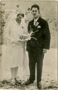 Nevesta ima pajčolan, ki sega precej na obraz, na vratu lepo verižico, na rokah rokavičke in v njih bel šopek, v katerem izstopajo mačice. Lahko so bile naravne, mojstrice pa so jih za posebne priložnosti znale narediti tudi iz krep papirja ali svile. Ivan in Milka sta se poročila sredi decembra in na tleh v ozadju slike je sneg. Nevesto v moderno krojeni obleki s spuščenim pasom je mogoče zeblo, a kaj bi to.