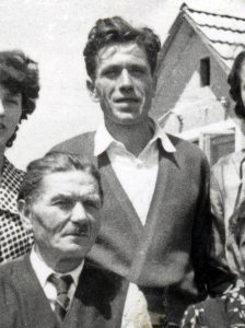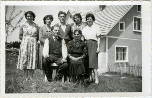 Spredaj sedita starša, že v častitljivi starosti, Jože Zalar-Bečajev oče in mati Marija Zalar.