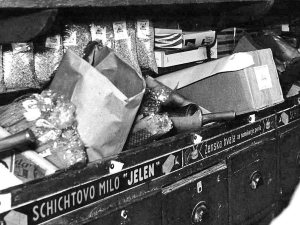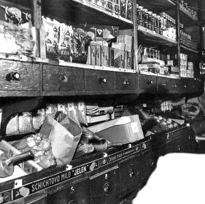 Prodajalec je stal za pultom in nanj zlagal želeno blago. Moko, sladkor in podobne jestvine je iz velikega predala zajemal z vevnico in sipal v škrnicl, ki je stal na pultu. Šele ko se mu je zdelo, da se je približal želeni količini, je škrtoc postavil na vago. Potem pa dodajal ali odvzemal. Nobenega »a je lahko malo več« ni bilo. Za olje in kis si moral prinesti svojo steklenico in napolnili so ti jo iz polnega soda. Prav tako petrolej, ki smo ga uporabljali za petrolejke ob dnevih, ko so bile električne redukcije. Sodi s petrolejem in oljem niso smeli biti v prostorih trgovine in so jih hranili zunaj ali v kleti, če so jo imeli.