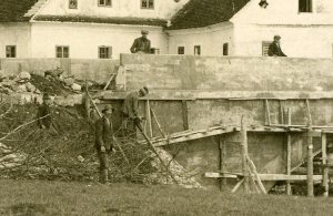 Gradnja mostu gre h koncu. Osem moških postav je ob njem in na njem. Večinoma urejajo zemljišče ob mostu, le dva sta prav na njem in bolj ko ne opazujeta druge. Morda sta se tja postavila zaradi fotografa, ki se je na Martinovi loki pripravljal k svojemu poslu … Na gradbišču še stojijo zidarski odri, most pa je že ometan, brežine in nasutja okoli njega pa so tudi vsaj deloma urejeni in utrjeni z zloženimi kamni. Na vrhu so še kupi gradbenega materiala, s katerim bodo najbrž uredili še zadnji del strmega obcestnega zemljišča.