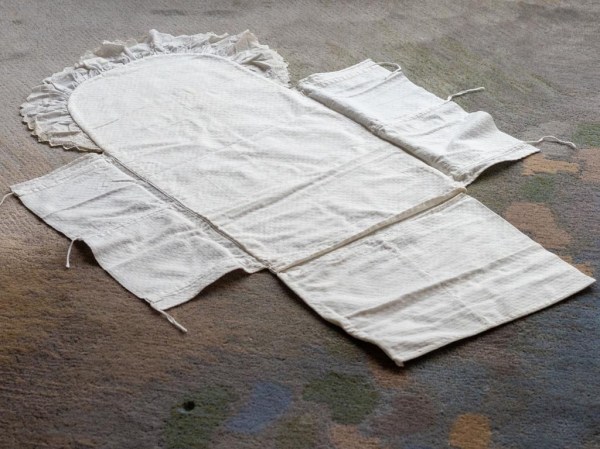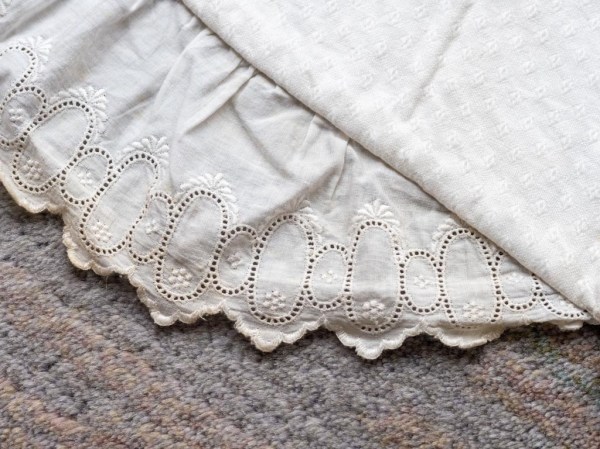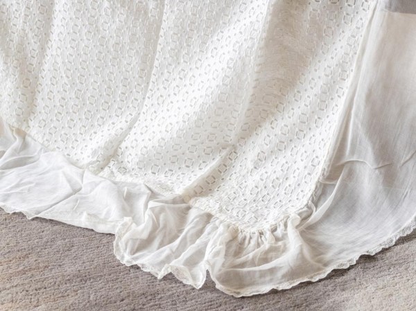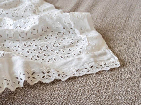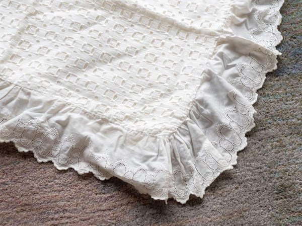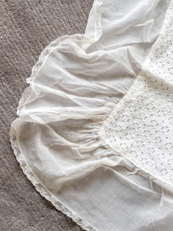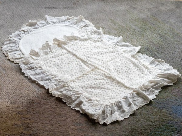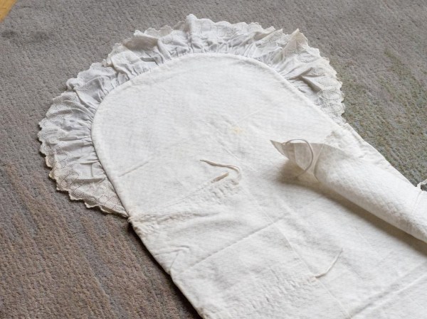 Krstna obleka je ostala po atovi teti Antoniji Gabrenja. Dobila jo je iz Amerike še pred letom 1920, a ne vemo točno kdaj. Kljub častitljivim letom je še v odličnem stanju. Kot otrok sem se z njo igrala in vanjo zavijala svojo nagravžno gumijasto punčko. Le te že davno ni več, obleka je ostala.