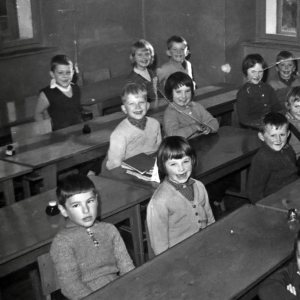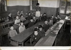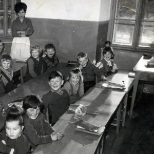 Osnovna šola v Grahovem, šolsko leto 1963/64 in učenci prvega razreda, slikani v svojem razredu. Ob strani stoji njihova razredničarka Marjeta Mikše, doma iz Cerknice. Ko se je kasneje poročila, je odšla iz rodne Notranjske nekam na Primorsko. Ob pogledu na razredničarko človek ne more spregledati njene visoke, natopirane frizure. Uaaaau… V prvi vrsti pa izstopa ob vseh nasmejanih in dobro razpoloženih učencih ena zelo zadržana deklica, ki ima prav tako lase urejene v pravo manekensko frizuro.