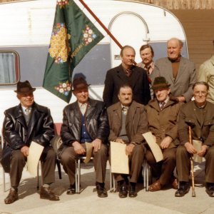 Na sliki prejemniki priznanj Antona Janše III. stopnje (bronasto priznanje), ki jo podeli čebelarska organizacija zaslužnemu čebelarju pri uspešnem opravljanju nalog in akcij v čebelarskem društvu. S praporom OZČD Cerknica, razvitim leta 1979, stoji praporščak Jože Ileršič.