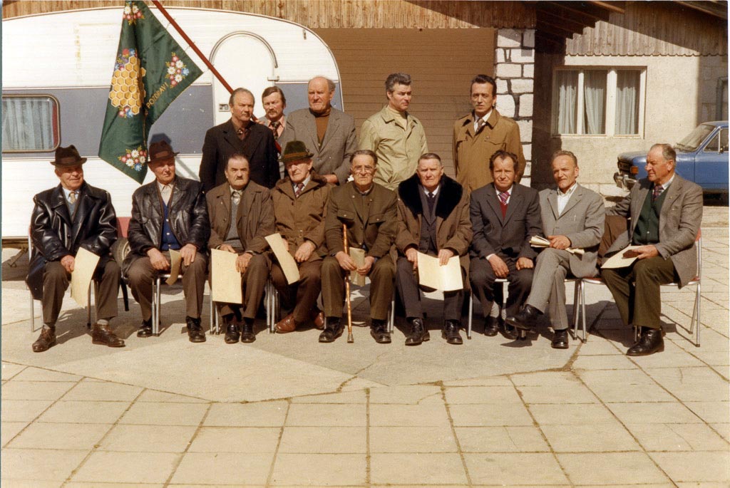 Na sliki prejemniki priznanj Antona Janše III. stopnje (bronasto priznanje), ki jo podeli čebelarska organizacija zaslužnemu čebelarju pri uspešnem opravljanju nalog in akcij v čebelarskem društvu. S praporom OZČD Cerknica, razvitim leta 1979, stoji praporščak Jože Ileršič.