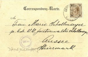 26. 5. 1899 je Heinrich Schollmayer poslal bolj skopo napisano dopisnico soprogi Marii. Maria je bila hčerka gozdarskega direktorja posestva Snežnik Jožefa Obereigner-ja.