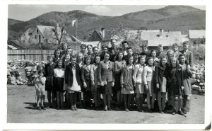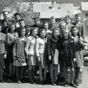 Deset dijakinj, štirje dijaki in dve manjši deklici ter razredničarka so na tem izseku. Razen učiteljice Marije Iglar, poročene Avsec, iz Starega trga ne poznam nikogar. Zanimivo je dekle v svetlem predpasniku, kakršen je bil po stari šegi še pred vojno sestavni del nedeljske dekliške noše. Manjše, bolj po otroško krojene predpasnike smo nosile tudi še deklice v prvem razredu leta 1956/57 in nekaj let pozneje.