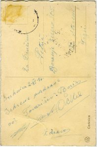 Znamko je odlepil najbrž kak zbiralec in z njo je šel tudi poštni žig, ki bi povedal, kje je bila razglednica oddana – pa saj je bilo skoraj gotovo v Cerknici.