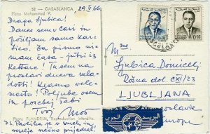 Razglednica je bila posneta v centru velemesta Casablanca, na Place Mohammed V, kjer je videti veliko stavb, banko, poslovne prostore in veliko osebnih avtomobilov. Napisal jo je dne 29. maja 1966 moj stric Uroš Domicelj na kratkem izletu v tem pristaniškem mestu svoji ženi Ljubici Domicelj, moji teti. V času od 25. februarja 1966 do decembra 1966 je bil stric kot detaširani delavec Rudisa poslan na delo v tujino v afriški Maroko. Domov se je vrnil malo pred božično-novoletnimi prazniki. Takrat so živeli v Ljubljani v večstanovanjski hiši v Rožni dolini. Kot je razvidno iz vsebine razglednice, se je stric odpravil v Casablanco na proslavo.