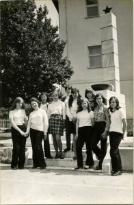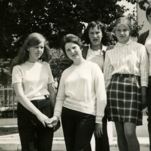 Slika deklet iz 8. razreda leta 1971 v Grahovem. Slikane pred spomenikom žrtvam NOB, pred svojo šolo. Slika je nastala v sklopu vsakoletnega spominskega slikanja razredov na šoli. Očitno so si dekleta zaželela ob klasični skupinski sliki še solo, žensko sliko. In fotograf Jože Žnidaršič se ni pustil prositi in že so bile v škatlici. Lepo je videti sošolke in dobre prijateljice skupaj. Kdaj se bomo še lahko takole skupaj slikale? Verjetno so že razmišljale o odhodu v srednje šole, kako se bodo vključile v novo okolje, ali bodo znale navezati stike in si pridobiti nove prijateljice, ali se bodo pogrešale … Veliko neodgovorjenih vprašanj se jim je podilo po glavi. Vsaka lepa stvar enkrat mine in pusti za seboj spomine. Če pa poleg spominov ostane še slika, je spomine veliko lažje obuditi. Prijateljice za vedno!