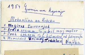 Ob steni sloni prislonjen motor Puch, ki je bil last fotografa Bajčka. Tudi podjetje se je imenovalo Puch. Sedež je imelo v Gradcu, Avstrija. Leta 1899 ga je ustanovil Slovenec Janez Puch. Proizvajali so avtomobile, kolesa, mopede in motocikle. Tudi moj stric je imel takšen motor. Z njim se je vozil po vsej Dolenjski na obisk k sestram in tudi k nam na Rakek. Oblečen je bil v usnjeno jakno in usnjeno čelado. Slednja bi verjetno kaj malo zalegla glede varnosti, če bi se z motorjem zvrnil.