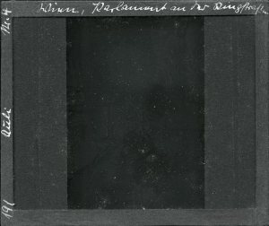 Pred Dunajskim parlamentom z votivno cerkvijo v ozadju plapolajo zastave. Uradni naslov fotografije je Parlament mit Rathaus und Votivkirche, Wien im III. Reich, Beflaggung (Parlament s parkom in votivno cerkvijo, Dunaj v III. rajhu, zastave).