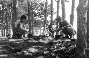 Kuhali smo streljaj od šotorov, kjer sta očeta uredila ognjišče. Čez kamna sta položila železno ploščo. Dobro se spominjam, da smo zjutraj redno kuhali kavo iz proje in z mlekom v prahu pripravili odlično belo kavo. Kadar je bilo vetrovno, smo občutili pravi “raj” peščene Rajske plaže. Pesek smo imeli v kavi in povsod drugod. Kljub temu smo uživali in se veselili vsakega novega dne. Vse naokoli je bilo dovolj suhljadi, tako da ni bilo težav s kurjavo. Morali pa smo paziti, da ne pride do požara. Ne vem več, kaj vse smo kuhali, verjetno tudi kaj iz konzerv. Kmalu po prihodu smo poskusili skuhati krompir v morski vodi, češ da ga potem ne bo treba soliti. Bil je ogaben, ker je Jadransko morje pač preslano. Tu in tja so nam prinesli kaj za pod zob domačini in nam prodali svoje pridelke, celo sadje in vino. Nekoč so nam prinesli lepo oskubljenega piščanca, kar je bila prava posebnost. Niti doma nisem videl kaj podobnega v prodaji, saj se je dalo kupiti na tržnici le živo perutnino. Kadar je prišla naokoli brhka mladenka s sadjem, je stric Jaro namenoma kupoval sadeže po kosih, da se je dekle čim večkrat sklonilo in ji je lahko gledal v bujno nedrje.