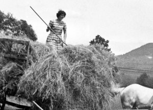 Dekle si pri tlačenju pomaga z grabljami. Z njimi enakomerno razporedi seno po vozu in ga potlači. Delo ji ni težko, ker je nasmejana.