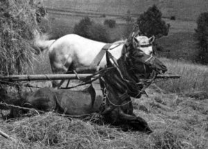 Kaj nista lepa! En bel, en črn ali morda rjav. Zanimivo je, da konj leži. Konji praviloma spijo stoje. Nekateri konji se kakšno noč uležejo za uro ali dve, nekateri le enkrat na teden. Konja, ki bi ležal »pri delu« pa še nisem videla. Tudi zaradi tega je slika zanimiva.Kraj: Loška dolina