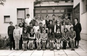 Razredničarka Gertruda Zigmund in njen 5.a razred v šolskem letu 1972/73 slikani pred osnovno šolo v Cerknici.