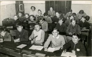 Jože Žnidaršič je prišel na šolo zgodaj spomladi leta 1961 in na podoben način poslikal vse razrede od 5. – 8. Takrat sem obiskovala 8. b razred in imam prav takšne fotografije. Prva je bila v taki postavi, kot vidite to, na drugih dveh pa so bili dečki slikani skupaj in deklice skupaj, in to pred tablo. Klopi so bile stare – zapuščina gimnazijcev – mi pa smo bili že učenci osemletke. Učilnice so ogrevali z zelenimi Lutzovimi pečmi na drva. Prostori so bili topli, ne spominjam se, da bi me kdaj zeblo. (Najbrž sem bila vsega vajena in mislila, da tako mora biti.)