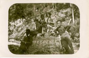 Alojz Tomec je v prvi polovici prejšnjega stoletja posnel ti dve sliki na izletu k slapovom v Peklu pri Borovnici. Kot predan Sokol je gojih vseh vrst športnih dejavnosti, tudi pohodništvo in izletništvo. Na prvi sliki je predzadnji od leve tudi on sam, z njim pa vidimo še tri dekleta in dva fanta. V ozadju je eden od slapov v Peklu. Mogočen prizor je to – skalovje, bučanje slapa, drobne kapljice vlage vsenaokrog in zaradi njih mogoče mavrica nad vodo v tolmunu, poleg pa šest mladih ljudi, ki tudi kipijo od energije in dobre volje …