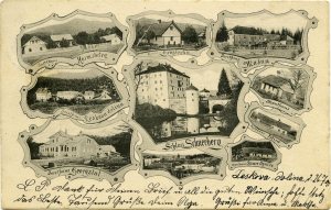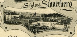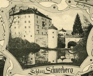 Na razglednici so grad Snežnik in številne gozdarske in lovske hiše v času Schönburg-Waldenburgov. Pred njimi so bili lastniki Lichtenbergi (1715 – 1853), ki so s snežniškim posestvom slabo gospodarili, kar nekajkrat so se znašli pred bankrotom. Tako so se odločili, da zadolženo posestvo prodajo na loteriji, kar je bilo takrat dokaj običajna praksa. S pomočjo veletrgovske hiše D. J. Coiths Sohn&Comp. na Dunaju so 1. decembra 1832 dali v prodajo srečke za srečolov po pet in štiri goldinarje konvencionalnega denarja. Glavna nagrada je bilo posestvo Snežnik v celoti, dobitnik pa je lahko namesto posestva vzel 250.000 goldinarjev v dunajski valuti. Glavni dobitek je zadel neki kovaški pomočnik z Madžarske, ki je raje vzel gotovino kot posestvo.