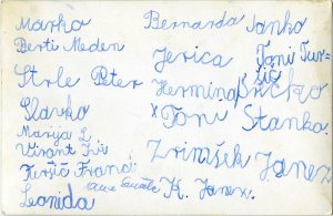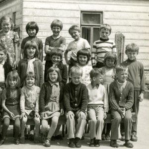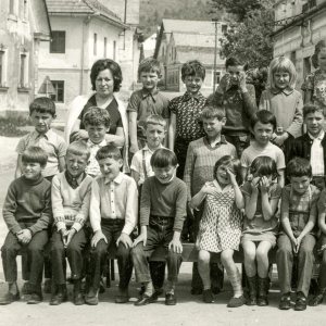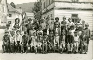 Učenci 1. razreda v šolskem letu 1974/75 iz podružnične šole v Begunjah, so se slikali ob svoji šoli. Tokrat jih je fotograf postavil v križišču ob šoli tako, da so gledali proti cerkvi. Za njimi se lepo vidijo hiše ob glavni cesti po Begunjah. Številčno generacijo je spremljala razredničarka Ana Šmalc.