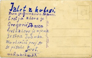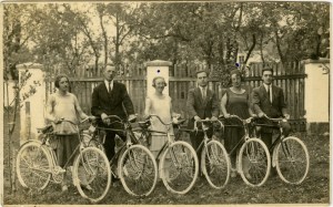 Sprašujem se, ali se niso kolesarji postavili le zaradi fotografiranja. Vsa kolesa so namreč moška. Dan danes to ni problem, ker tudi ženske kolesarijo v kolesarskih hlačah. Za tale krila pa zna biti kar težava. Težave bodo imeli tudi moški, če si ne bodo s ščipalko speli hlač. Nobeno kolo nima ščita na verigi. So pa vsi montlni beli. Iz tega sklepam, da so kolesa nova. Novo kolo je tedaj stalo v povprečju 750 din. Povprečna plača nameščenca je bila 2.000 din.