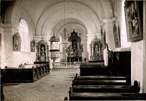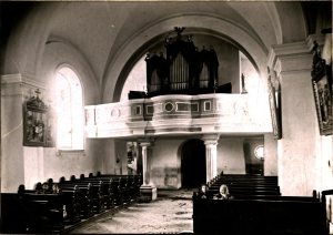 Pogled proti vhodu in na kor, kjer se vidijo piščali orgel. Kdo sta gospe v prvi klopi zadnjega dela, najbrž ne bomo ugotovili.