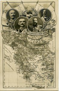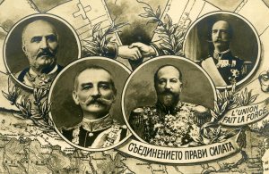 Na sliki je bolgarski propagandni letak iz leta 1912. Na njem so zavezniške države Balkanske lige s svojimi predstavniki in zastavami. Prvi z leve je črnogorski vladika Nikola Petrović Njegoš, za njim srbski Miloš Obrenović Peter I. Karađorđević 1 , nato bolgarski Ferdinand I. Maximilian Karl Leopold von Saxe-Coburg-Gotha in slednji Konstantin I. grški.
