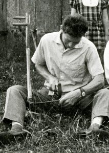 Sosed Jože Korenčan, Možakov po domače, je prišel pogledat strica in se nam pridružil pri slikanju. Kot je videti na sliki, je zelo na kratko postrižen. Mogoče je vzrok temu praktičnost, mogoče pa tudi ušivost, ne vem, spomnim pa se, da po navadi ni bil tako kratko ostrižen. Na sliki ima samo delno zapeto srajco, bil je starejši od nas in je že vedel, kako biti frajer.