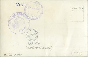 Na zadnji strani razglednice so trije žigi.