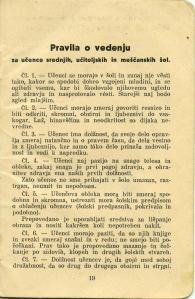 V zadnjem delu Dijaške knjižice so natisnjena zelo zanimiva Pravila o vedenju za učence srednjih, učiteljskih in meščanskih šol. Marsikateri člen bi bil priporočljiv tudi za današnji čas. Zaradi aktualnosti in zanimivosti vsebine pravil sem se odločil za objavo celotne vsebine.Sledilo je šolsko leto 1944/45. Obiskoval je III. a. razred II. MOŠKE REALNE GIMNAZIJE V LJUBLJANI. (KNABENREALGYMNASIUM in LAIBACH). Ponovno je stanoval v Salezijanskem zavodu v Ljubljani. Tu se je šolal do leta 1945, ko je bil nekaj mesecev pred osvoboditvijo izključen iz šole zaradi simpatizerstva z narodno osvobodilno fronto.