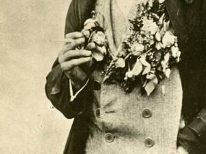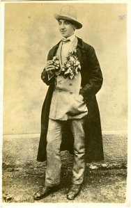 Čemu je namenjena okrasitev z rožami? Pod suknjičem iz volnenega blaga ima telovnik enake barve. Srajca je bela. Kot srajce nekdaj niso imele ovratnikov, tudi niso imele manšet. Moški so uporabljali ločljive ovratnike in manšete. Na tej sliki se jo lepo vidi. Ne manjka pa za tisti čas obvezna cigareta. Nekdaj je bilo kajenje znamenje prestiža. Danes je pokazatelj – česa že?