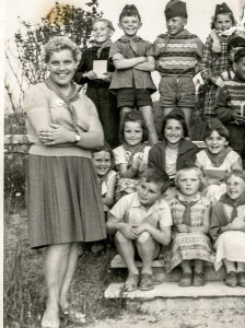 - Ob učencih stoji učiteljica in razredničarka Vera Tomšič.