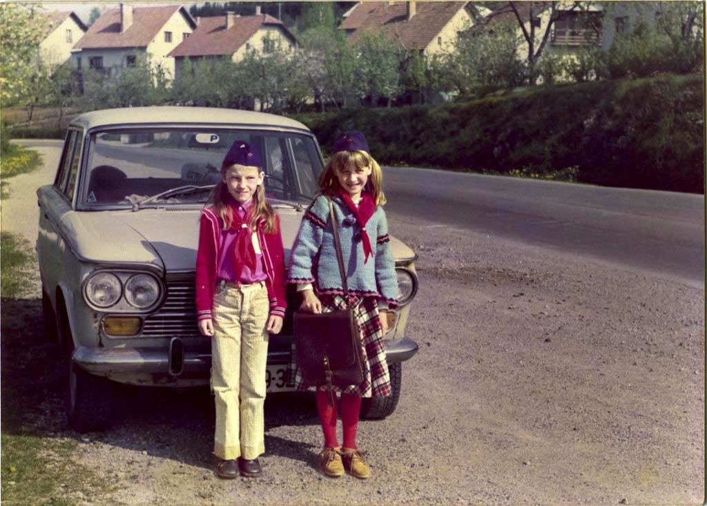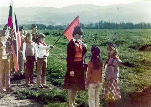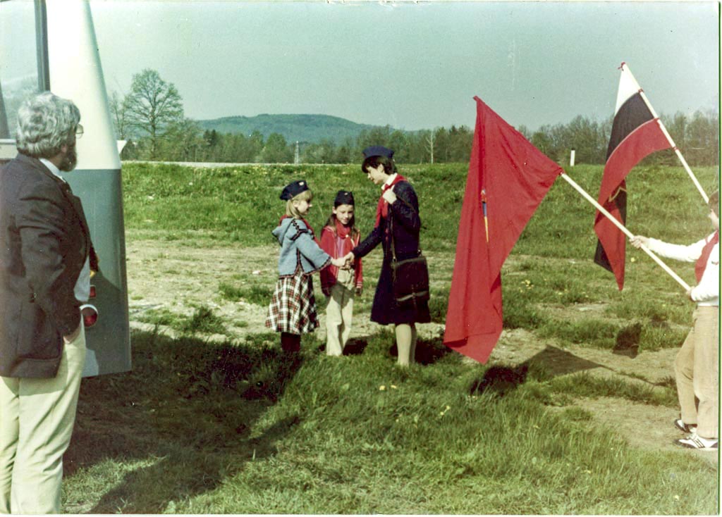 Leto 1983. Delegacija pionirjev iz Ilirske Bistrice predaja kurirsko torbico pionirkama Pionirskega odreda Turšič Ivan – Iztok iz OŠ Jožeta Krajca z Rakeka.