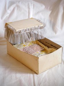 Kaj pa posteljica? Nastala je iz škatle za čevlje, kot prikazuje slika. Od tod naprej je bilo treba poskrbeti samo še za punčkino garderobo in posteljnino. K sreči smo imeli v vasi šiviljo, ki nam je večkrat odstopila pisane krpice, iz katerih so s pomočjo škarij, sukanca in igle nastale skrbno izdelane oblekice.