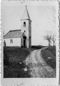 “Kip Žalostne matere božje so po ljudskem izročilu prenesli iz cerkve sv. Andreja, ko so zgradili kapelo. Kapela ni imela svojega premoženja … (Drugi, op. M. O.) zvon je bil ulit leta 1924, težak je 75 kg in ima glas F. Pred leti je fasado zvonika brezplačno obnovil domačin Alojzij Okoliš.” No, na tej sliki je fasada še okrušena in tisto popravilo se je moralo zgoditi nekje konec šestdesetih ali v sedemdesetih letih; spomnim se, da so ga omenjali.
