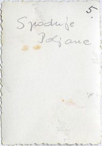 Slika je iz zapuščine Alojza Tomca, letnico pa sem ji določila zgolj po občutku glede na vrsto in barvo fotografskega papirja ter svojih spominov. Miniaturna sličica mi je bila že na prvi pogled domača, ko sem prebrala zapis na hrbtni strani, pa je bilo jasno zakaj: Dolenje Poljane so, kapela Žalostne Matere božje sedem žalosti, pogled z vaške poti proti severu – prav tu sem stala, ko sem kapelo kot otrok na obisku v materini rojstni vasi prvič zagledala. Mimo nje vodi precej dobro nasut kolovoz, na desni je nekaj drevesc, mogoče na pol divjih sliv, ni pa jasno, kaj je silhueta na levi – možak, ostrnica ali kaj tretjega.
