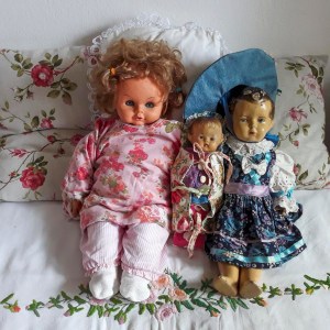 Ta punčka pa je bila preveč okorna, da bi se dalo z njo igrati. Bila je trda, težko se jo je oblačilo, mimogrede je dobila kakšno »poškodbo« in se je na tistem mestu oluščila. Tako je prevzela vlogo »tržaške punčke« in obsedela na divanu. Ima pa še danes neverjetno stabilnost. Sama stoji. Tudi po tem, ko je popustila elastika v kolkih in je bila potrebna »operacija«, ki sta jo opravila moja brata. Miklavž ji je prinesel celo voziček, mama pa ji je veliko kasneje naredila iz krpic hlačke z »lackom« in kapico. Tudi jaz sem ji iz nostalgije pred nekaj desetletji sešila kar nekaj imenitnih oblekic. Untarca in bluzica sta narejeni iz moje untarce.