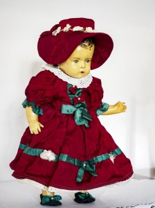 Z mamo sva se ustavili pred Namo. Iz ogromne polkrožne izložbe je strmelo v naju zelo veliko punčk, majhne, velike, lepo oblečene, v kopalkah … Bila sem vsa omotična od mestnega vrveža, velikih hiš, žlobudravih ljudi. Ne vem, če so me sploh vprašali, katero punčko bi rada, že sva se z mamo znašli spet na ulici. Jaz z novo punčko. Ni imela kiklce, bila je samo v kopalkah, brez čeveljcev, brez pravih las, tudi oči ni zapirala. Bila je tudi med najmanjšimi v tisti izložbi. (visoka je 44 cm) Vendar je bila samo moja. Zasmilila se mi je, ker ni bila zadosti oblečena in sem jo stisnila pod moj novi plašček. Še vem, da je bil vinsko rdeče barve, narejen po meri in tudi klobuček iz enakega blaga sem imela. Strašno imenitna sem se zdela sama sebi.